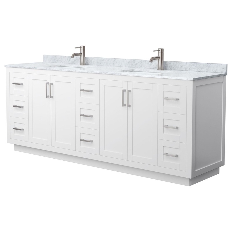 Sleek and chic are the best words to describe this European shaker vanity, a piece that bridges modern and contemporary. The Miranda vanity is manufactured in high quality durable materials and finished to the exacting standards you’ve come to expect from the Wyndham Collection. With function as important as form, the elegant design focuses on ample storage and counter space, a choice of three different handle colors, and 3D adjustable soft-close doors and dovetail drawers. Included Components: Covered under Wyndham Collection’s 2 year limited warranty Plywood vanity cabinet with 4 doors 9 drawers 2 shelves Marble vanity top with 2 porcelain sinks and matching backsplash Faucet is not included and must be purchased separately Cabinet Features: Constructed from plywood providing a lifetime of durability Free standing installation vanity is seated on the floor with wall anchors, providing a functional design 4 door design provides easy access to storage space 9 full extension drawers with soft-close slides allow for organized storage Soft close drawer slides operate on smooth ball-bearings and prevent drawers from slamming shut Vanity will need to be assembled Vanity Top Features: Marble vanity top includes 2 undermount sinks 2 pre-drilled faucet holes per basin Center drain location provides optimal draining capability Equipped with an overflow drain to help prevent water overflow and spillage from occurring Vanity includes matching backsplash Cabinet Specifications: Cabinet Width: 83-1/4″ (from left to right) Cabinet Height: 33″ (from top to bottom) Cabinet Depth: 21-3/4″ (from front to back) Number of Doors: 4 Number of Drawers: 9 Number of Shelves: 2 Vanity Top Specifications: Vanity Top Width: 84″ (left edge to right edge) Vanity Top Depth: 22″ (front edge to back edge) Backsplash Height: 3″ Number of Basins: 2 Sink Basin Measurements: 17″ L x 11-1/4″ W x 6-1/2″ H Number of Faucet Holes: 2