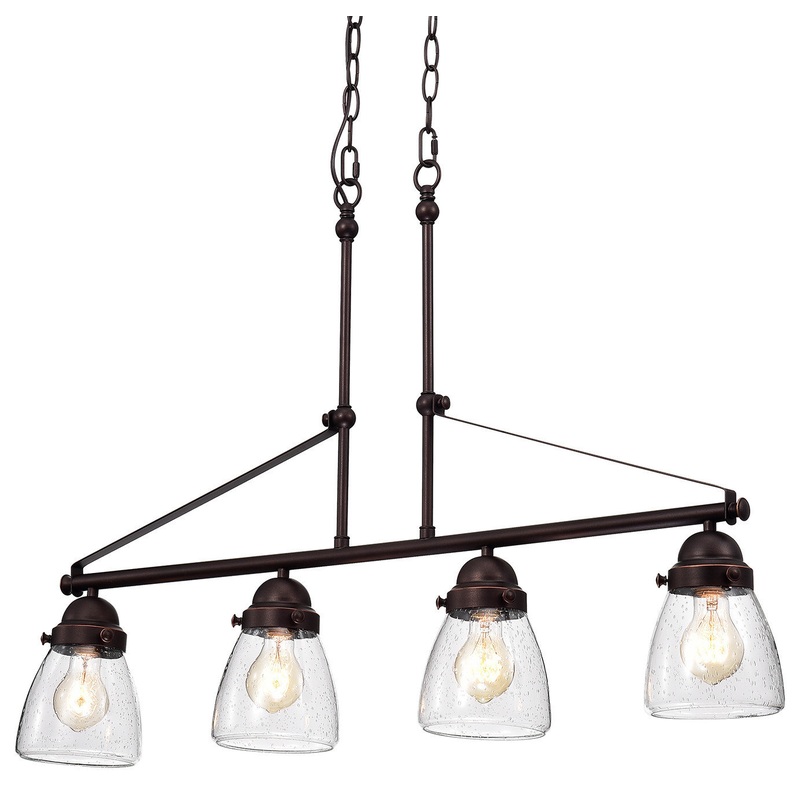 This four light chandelier has an oil rubbed bronze finish with seeded glass shades around each bulb. The linear of the metal rods that makes up the foundation of the fixture, creates interest provides direct lighting. The 48-inch chain can be adjusted by removing links and can be hung at a preferred height.