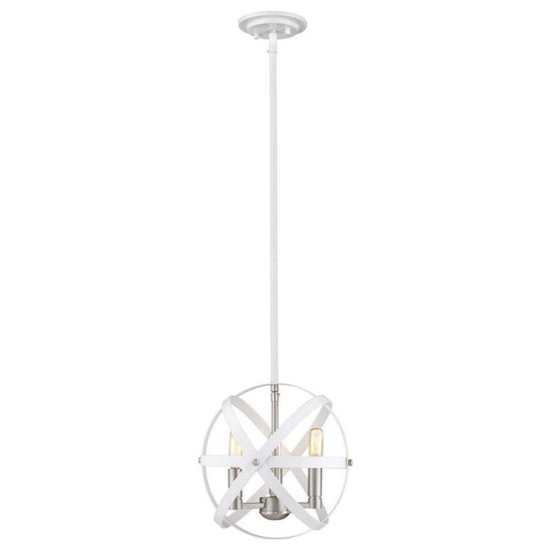 Designed for brilliance, this hanging pendant light is sleek and radiant. Complete with hues of hammered white and brushed nickel, the rings and rods from the open silhouette frame a suspended bouquet of exposed lightbulbs.