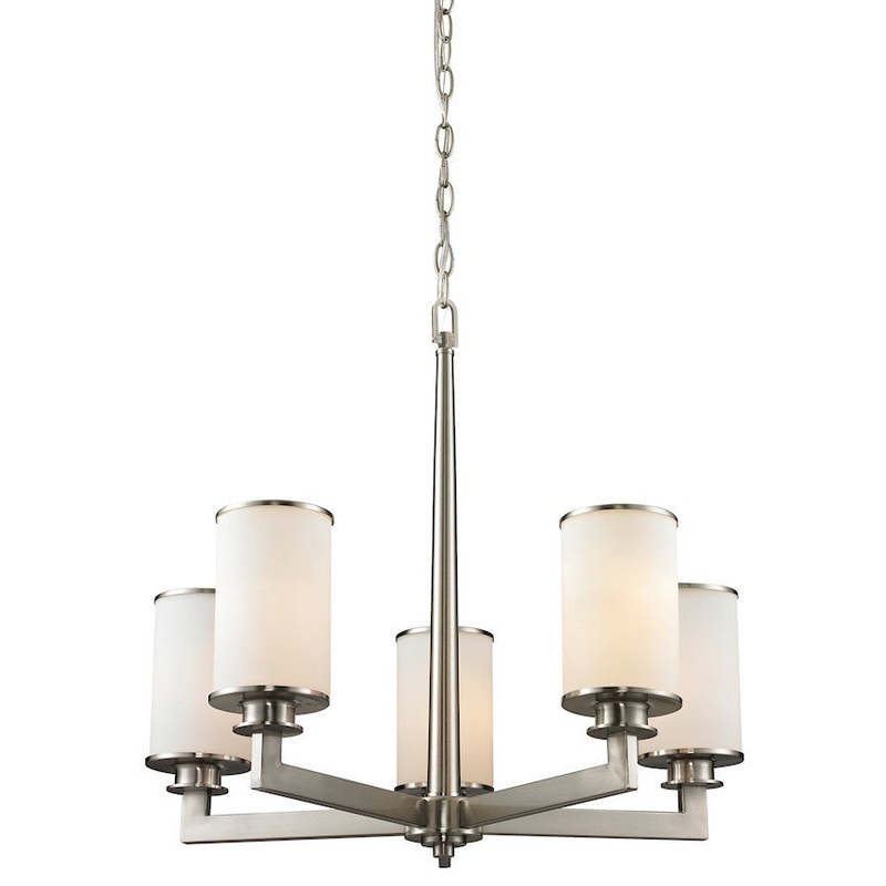 The contemporary Savannah family adds sophistication to home decor. The beautifully appointed brushed nickel fixture is perfectly paired with matte opal glass shades in this 5 light chandelier. -Finish: Brushed Nickel -Made of SteelShade Finish/Color: Matt