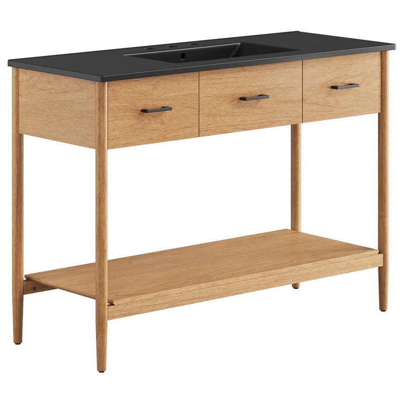 Infuse your bathroom decor with the subtle charm and simplicity of the Zaire 48 Bathroom Vanity. This exquisite washstand combines sleek, contemporary lines with the natural beauty of wood in an organic minimalist design. Crafted from MDF and solid rubberwood and topped with a wood grain veneer, this vanitys design is emphasized by metal handle pulls on its three drawers, giving it a touch of urban chic. While the middle drawer is fixed, the two end drawers offer ample storage space to neatly tuck away your bathroom essentials. Below this, you’ll find an open shelf, ideal for holding towels or showcasing your favorite decorative pieces. Featuring a sleek single sink ceramic basin with 8″ centerset holes and an integrated countertop, this vanity easily becomes a functional centerpiece in your bathroom. This vanitys tapered wood legs are a modest and understated design choice that completes the overall simple mid-century aesthetic. Includes adjustable, non-marking feet for added stability and floor protection. Assembly required. Fixtures not included. Weight Capacity: 375 lbs.