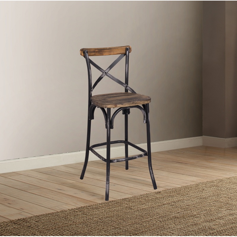 ACME Zaire Bar Chair (1Pc), Antique Black & Antique Oak, 29" Seat Height, 43"H, 29" Seat Height, 17lbs. The Zaire collection chairs offer a vintage style inspired by Parisian Bistros chairs. Features: reclaimed wood and metal looks, simple "X" style backre