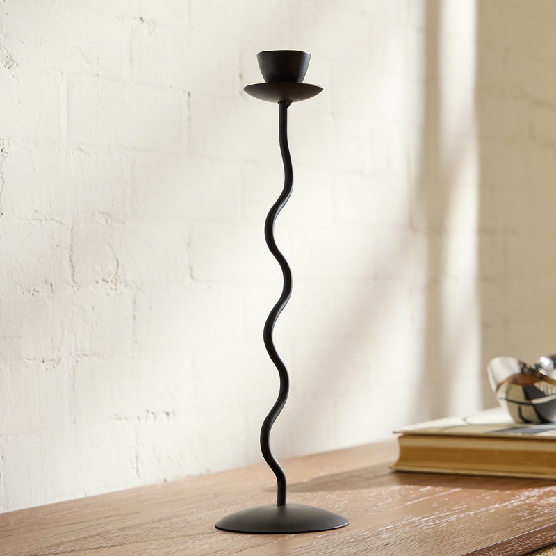 Wavy zigzag silhouettes bring playful, modern character to any surface. Crafted from iron and aluminum with an antique bronze finish, these taper holders offer both form and functionkeeping candles securely in place while adding sculptural interest. A lively accent for mantels, dining tables, or desktops that invites movement and charm into your decor.