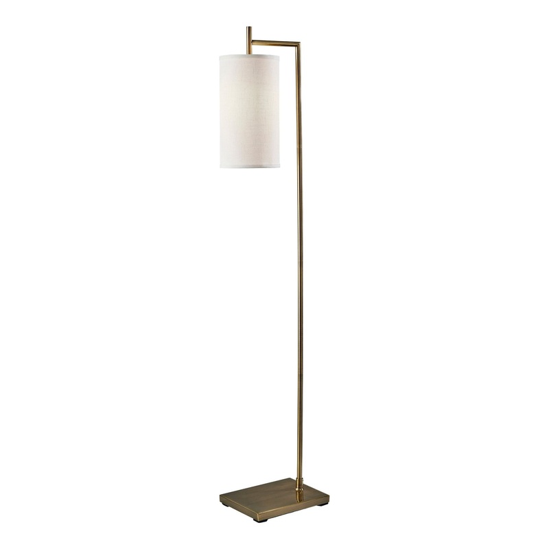 Stylishly illuminate any room with the mid-century modern design elements of the Zion floor lamp. The base and stand feature a monochrome antique brass finish and clean lines and angles. A long slender pole rises from the compact rectangular base and supports a short arm. Suspended from the arm is a tall drum shade made of white textured fabric that softly diffuses the light from a 100W bulb. The floor lamp is also available with a black metal finish and beige textured shade.